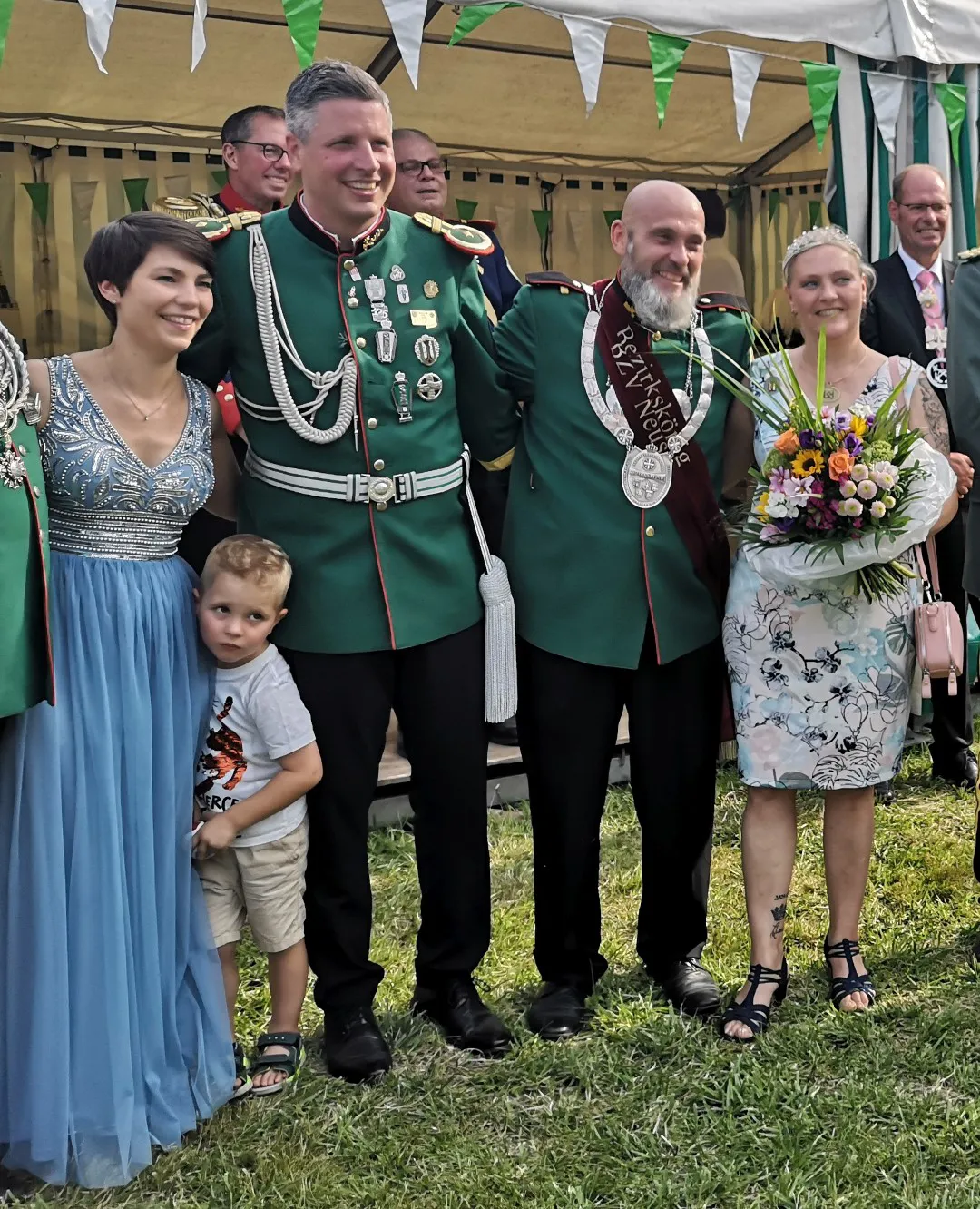 Der scheidende Bezirkskönig Björn Haas aus Hoisten mit dem neuen Bezirkskönig Thomas Goerdts von der Schützenbruderschaft St. Peter und Paul 1879 Rosellerheide-Neuenbaum mit Ihren Königinnen.