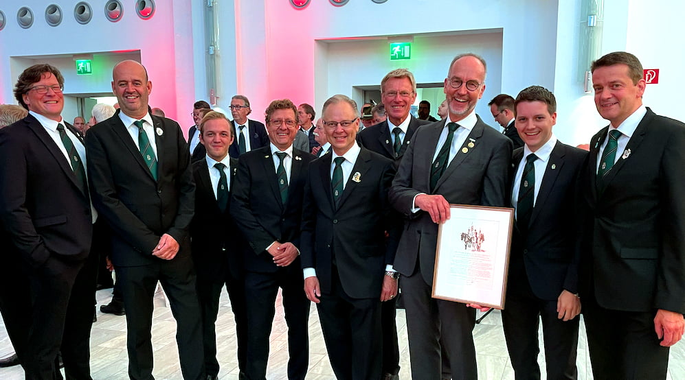 Die Morgenfeier mit Majorsfrühstück wurde dann in den trockenen Räumen des Neusser Scheibenstandes unter den geltenden Corona Bedingungen fortgesetzt. Unter der Begleitung der vereinigten Jägerkapelle Straberg konnten sich die Schützenbrüder bei einem Frühstück erstmal stärken. Besonders begrüßen konnten die Scheibenschützen den Kapellmeister Willi Winkels, der nachträglich sein Geburtstagspräsent entgegennehmen konnte. Als ersten Repräsentanten der Gesellschaft wurde der seit 2019 amtierende Jakobuskönig Edelbert Jansen begrüßt. Zu den Ehrengästen gehörte auch Markus Jansen, Schützenbruder und Komitee Mitglied, der pandemiebedingt die freigewordene Zeit nutzte um mit seinen Schützenbrüdern zu feiern. Unter anderem erhielt der Major Dr. Hans-Peter Zils die Urkunde für seine 25 jährige Mitgliedschaft durch den Bund der Historischen deutschen Schützenbruderschaften. Nach der Auszeichnung von weiteren Schützenbrüdern für langjährige Zugehörigkeit zum Zug folgte noch eine besondere Amtsübergabe: Axel Schulz, Schützenbruder, 35 Jahre Zugleitungsmitglied und 20 Jahre Spieß des Zuges übergab den Staffelstab an sein Zugleitungsmitglied, den Feldwebel Thomas Weilandt, der die Ernennung zum Spieß freudig entgegennahm.